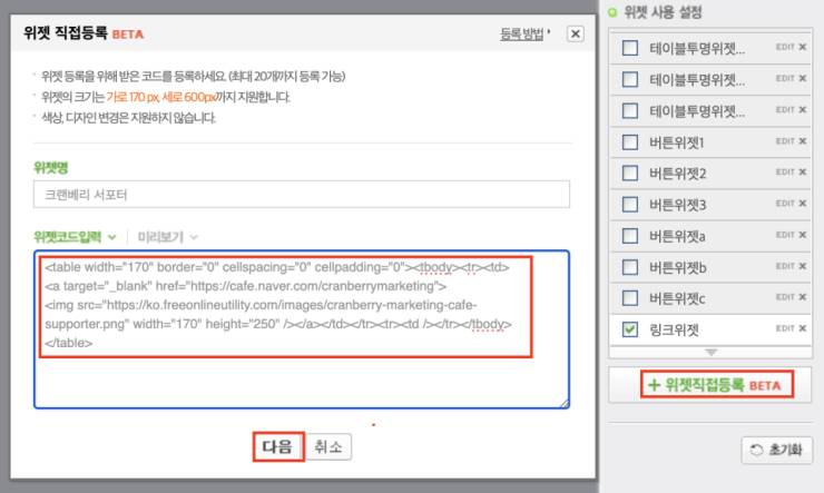 *등급 업그레이드1: 위젯 추가후 무료 온라인 유틸리티 게시판(카페 가입 필요.)에 블로그 주소와 함깨 위젯 등업 요청을 해주세요. 예 일반 (24시간) - 씨앗 (7일)
