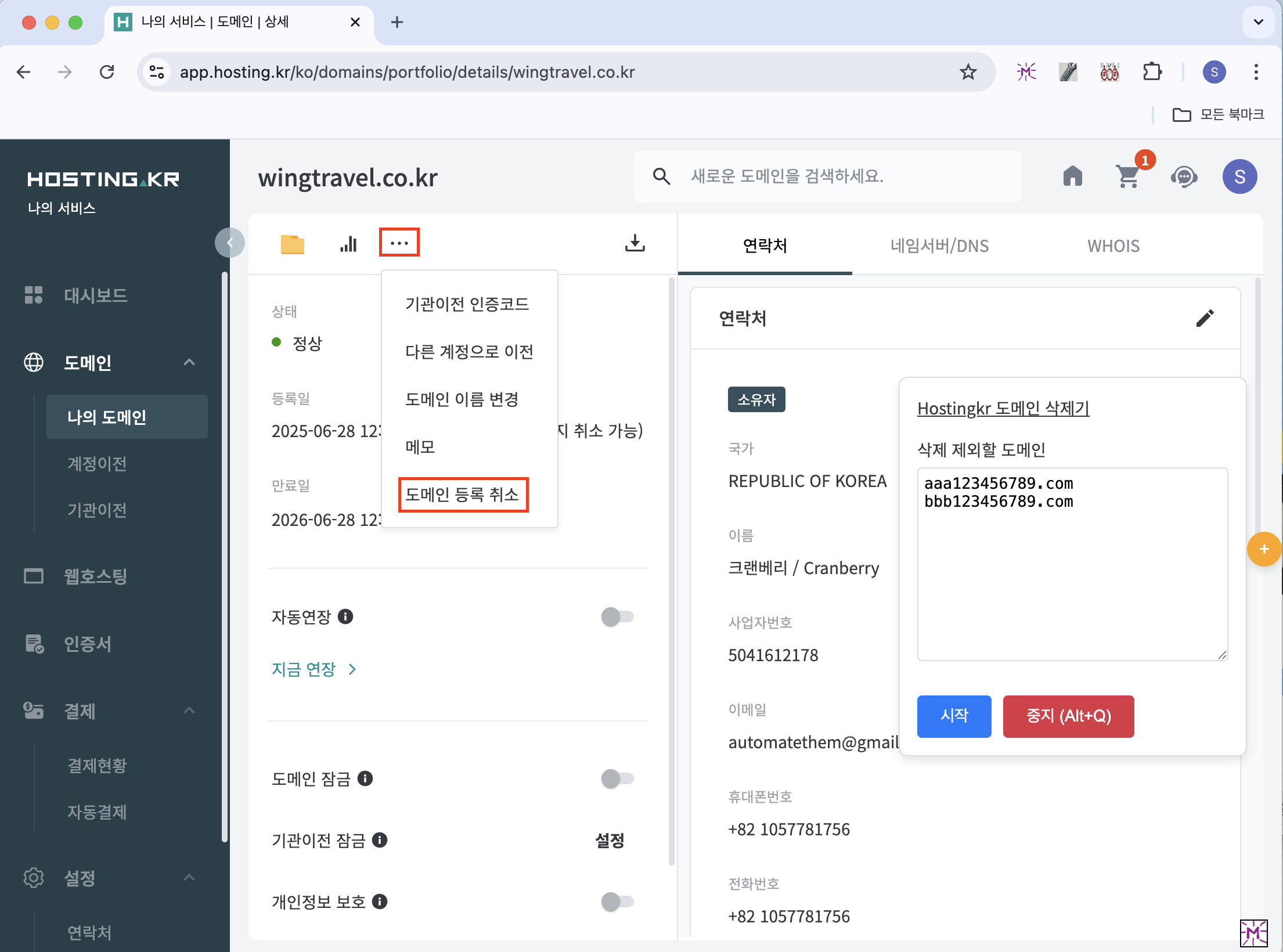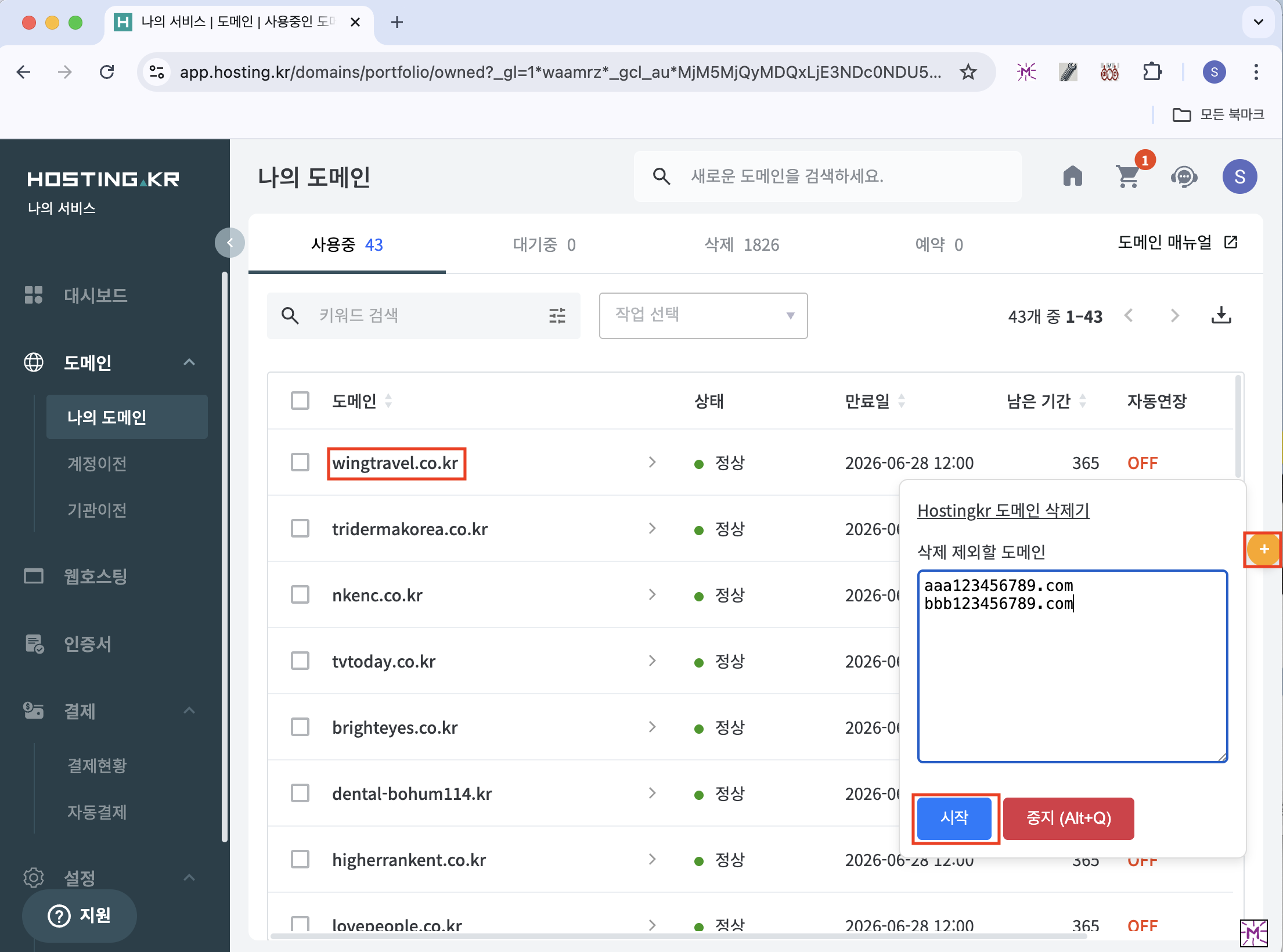 Hostingkr 도메인 삭제기는 https://hosting.kr/ 의 나의 서비스 - 도메인 - 나의 도메인 메뉴에서 취소 가능 도메인을 삭제해 주는 브라우저 확장 유틸리티 입니다.