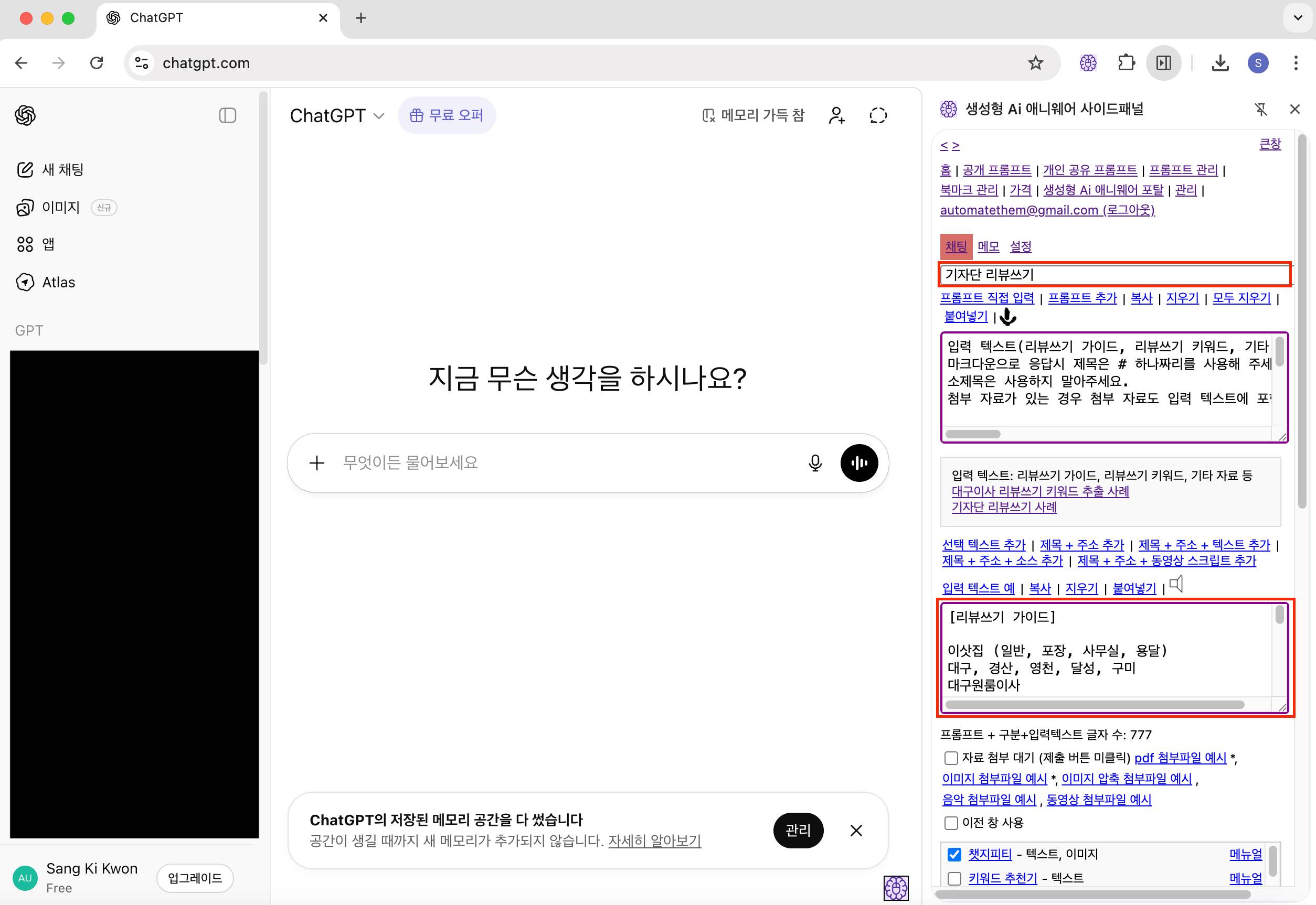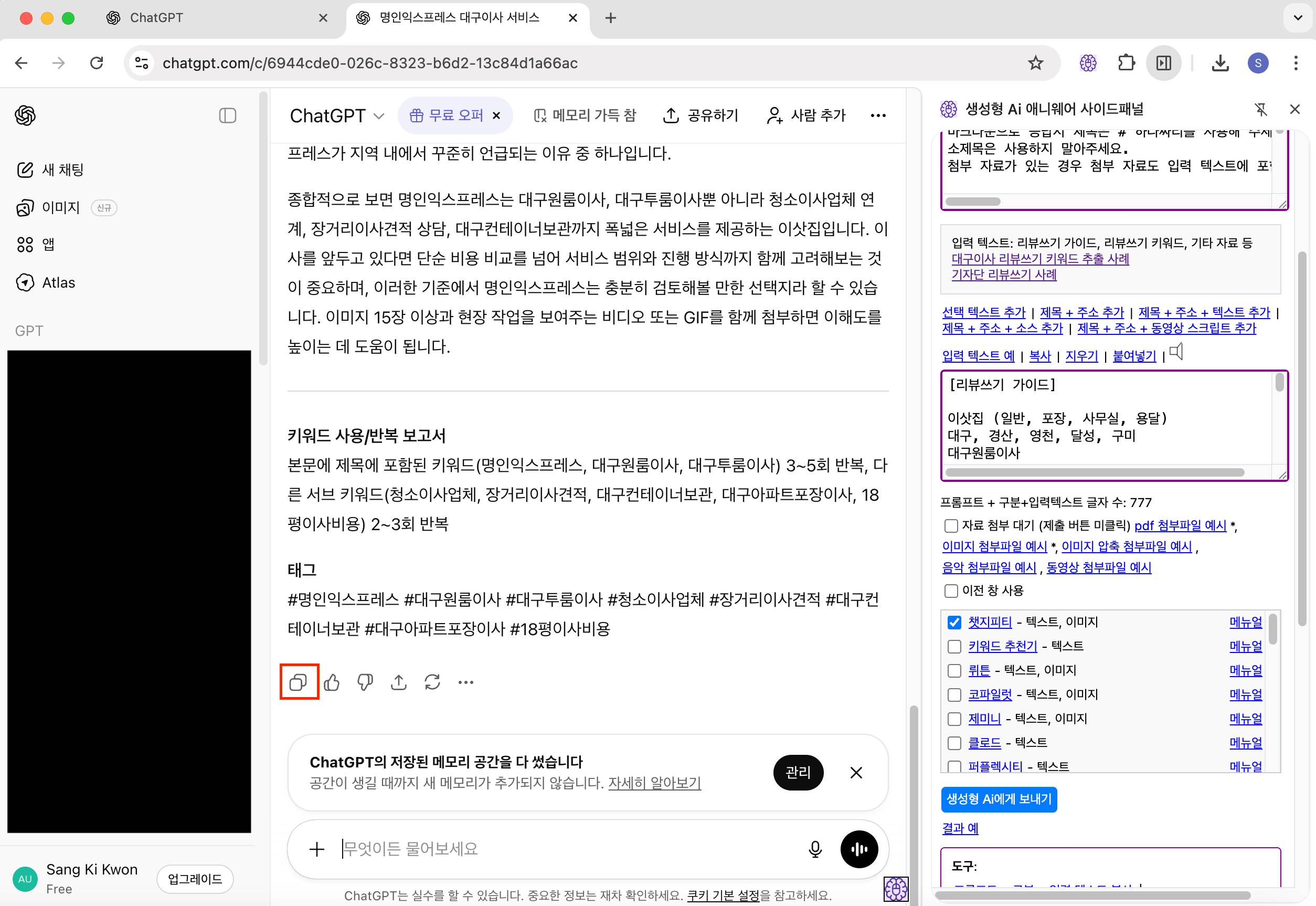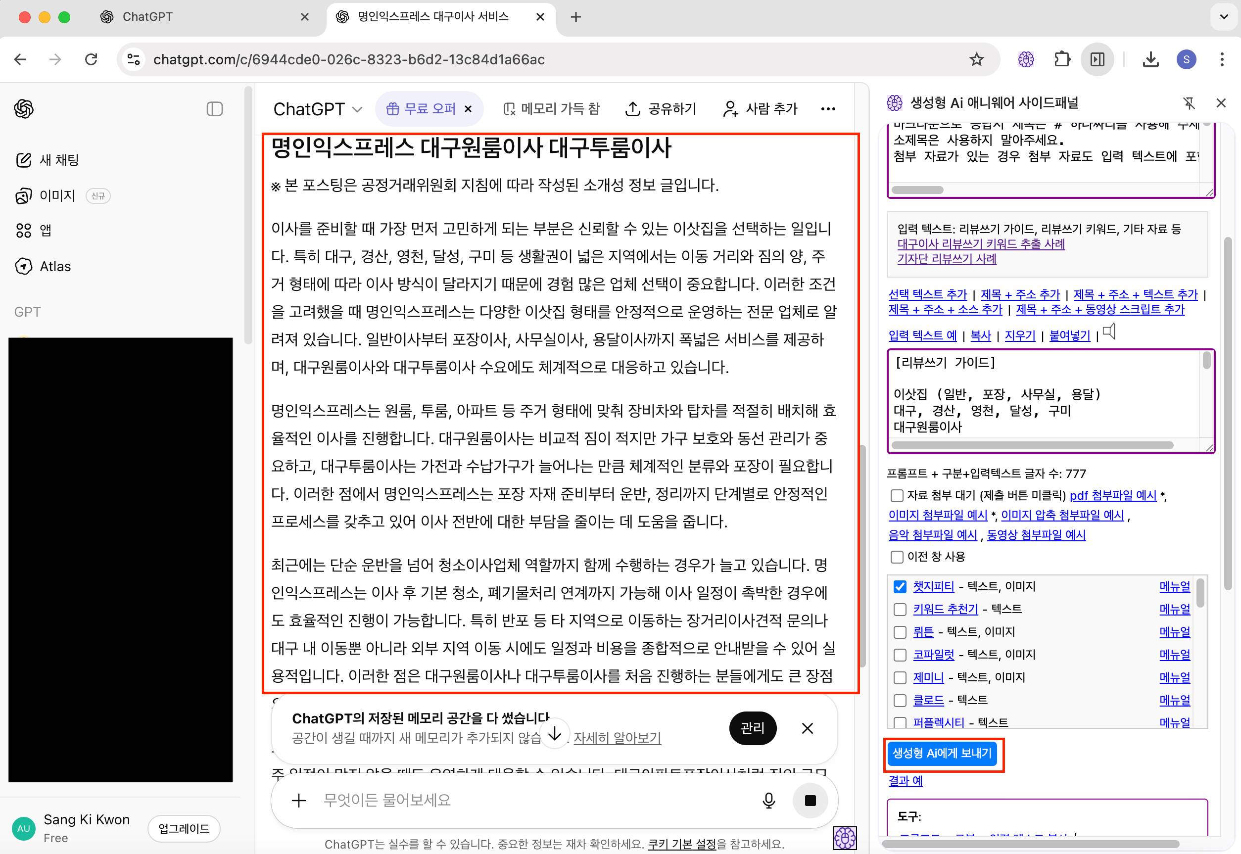예를 들어 사이드 패널의 기자단 리뷰쓰기 템플릿에서 생성형 AI에게 보내기 버튼을 클릭하면 생성형 AI가 자동으로 원고를 생성합니다. 마크다운으로 작성된 원고를 다시 생성형 AI 로 HTML 변환 혹은 처음부터 HTML 생성합니다.