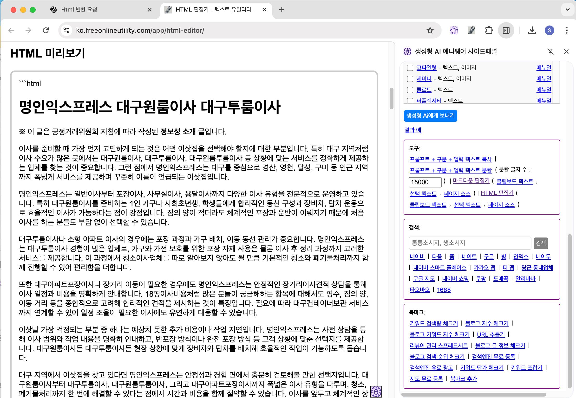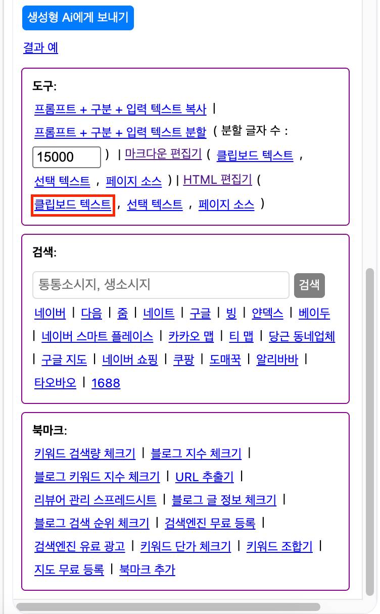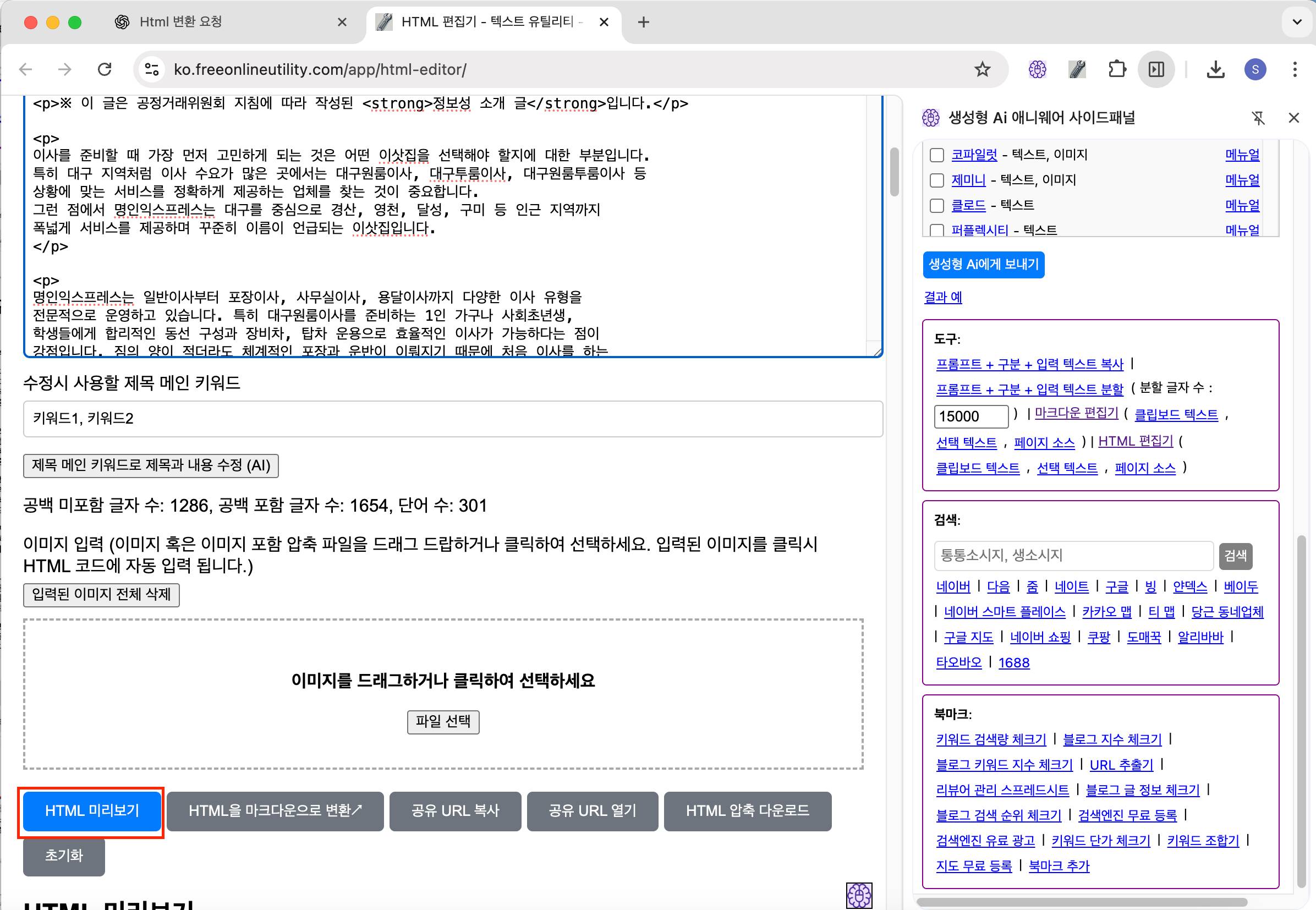 생성된 원고는 복사 아이콘을 통해 클립보드로 복사할 수 있으며, 마크다운 괄호 안에 표시된 클립보드 텍스트를 클릭하면 복사된 내용을 HTML 편집기에서 바로 불러와 미리보기를 하며 상단 HTML 입력에서 내용을 편집할 수 있습니다.