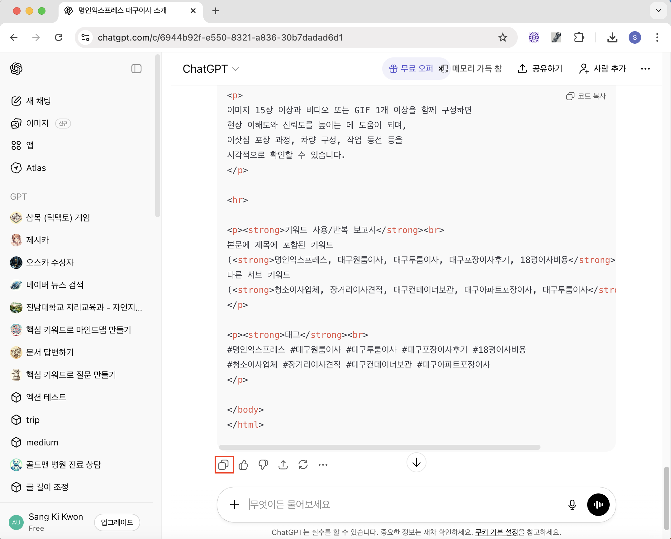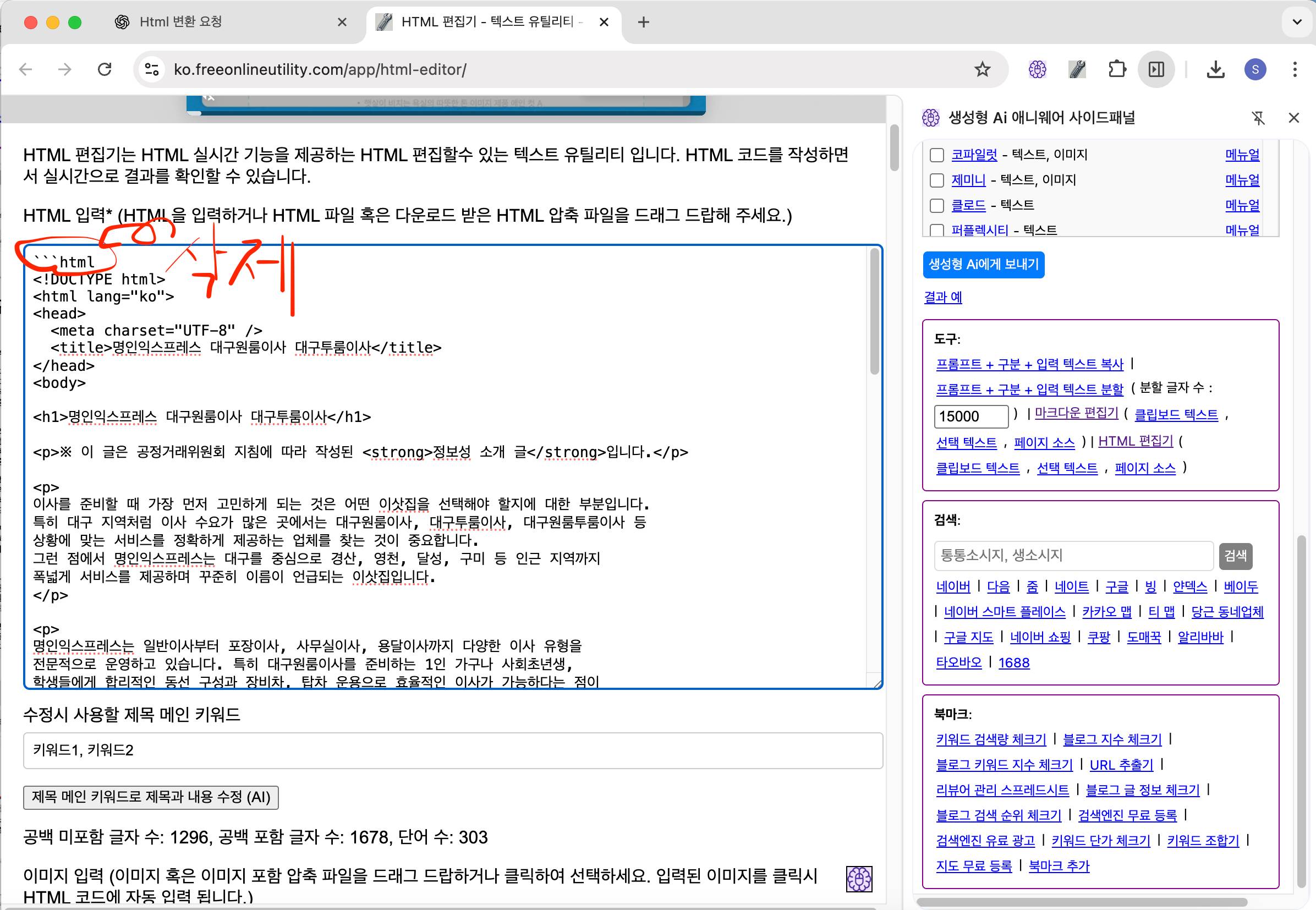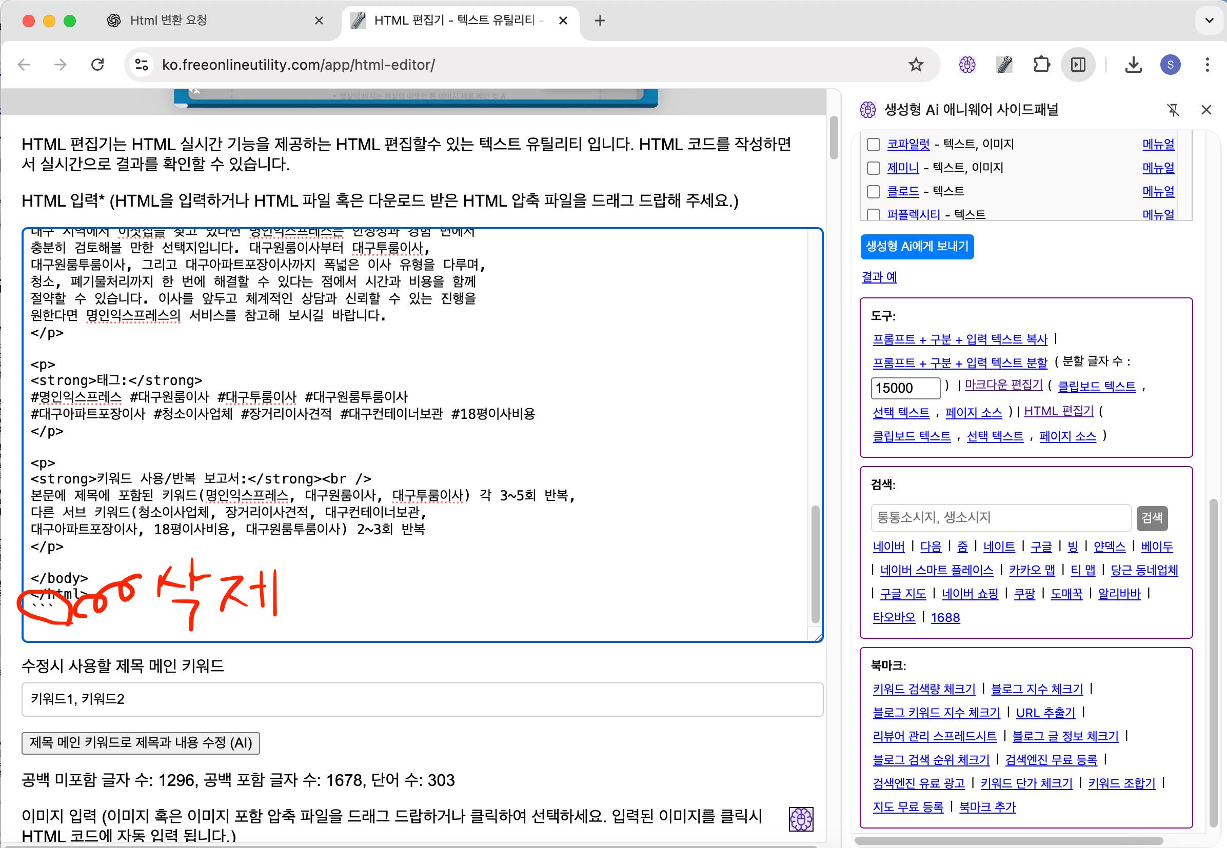 생성된 원고는 복사 아이콘을 통해 클립보드로 복사할 수 있으며, 마크다운 괄호 안에 표시된 클립보드 텍스트를 클릭하면 복사된 내용을 HTML 편집기에서 바로 불러와 미리보기를 하며 상단 HTML 입력에서 내용을 편집할 수 있습니다.