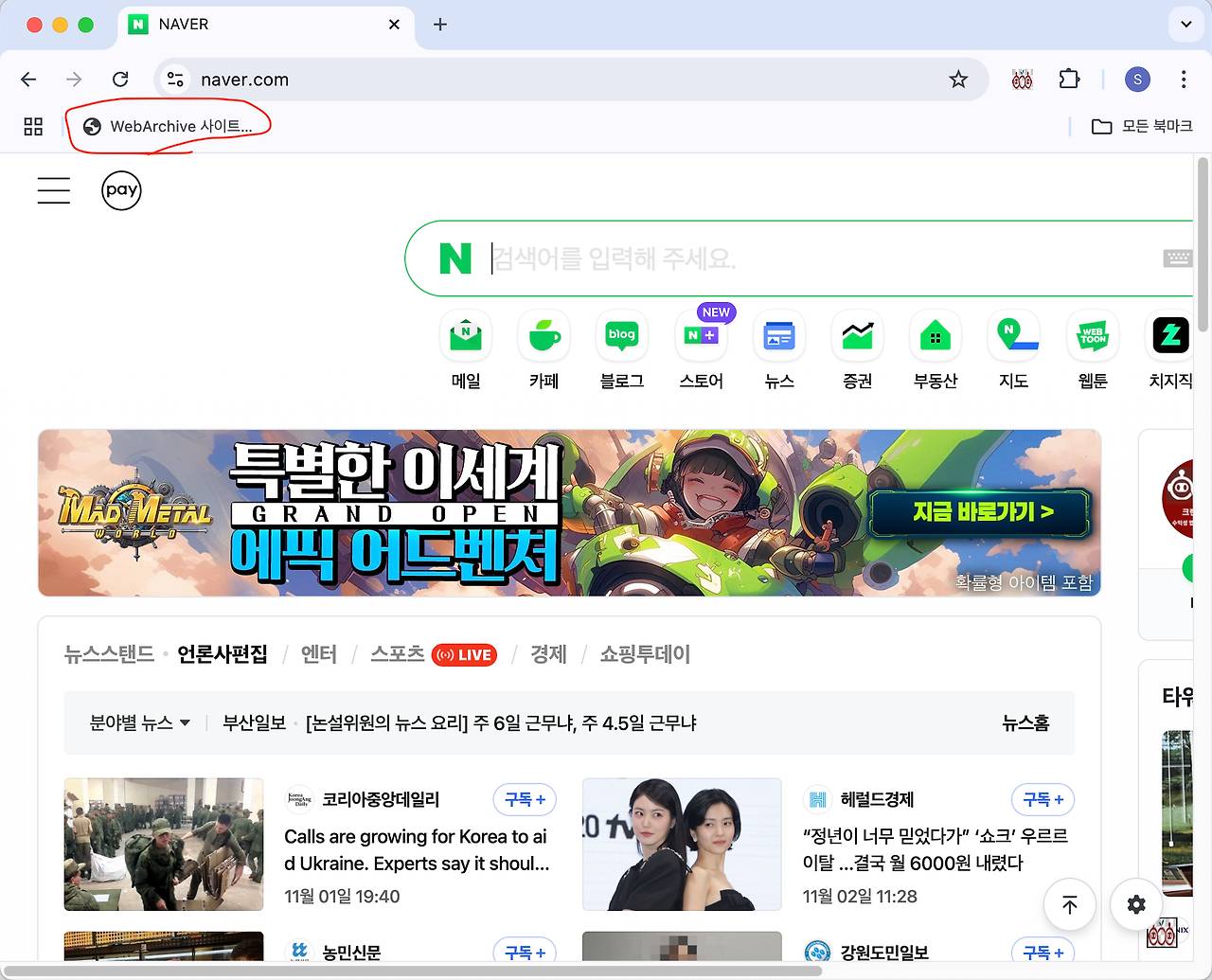 웹어치브 오프너는 현재 접속한 사이트에 대한 웹어치브 히스토리 정보를 보여 주는 북마크릿 입니다.