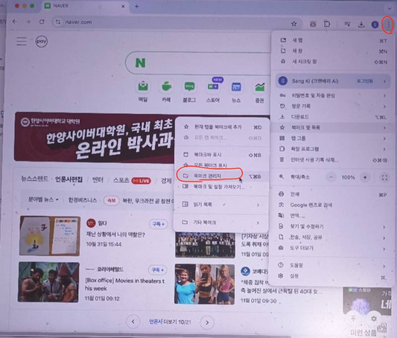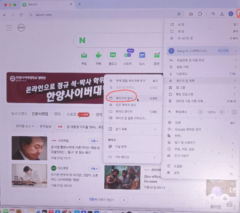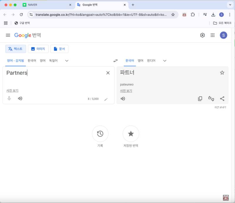 특정 글자를 선택후 추가된 구글 번역 북마크 버튼을 누릅니다