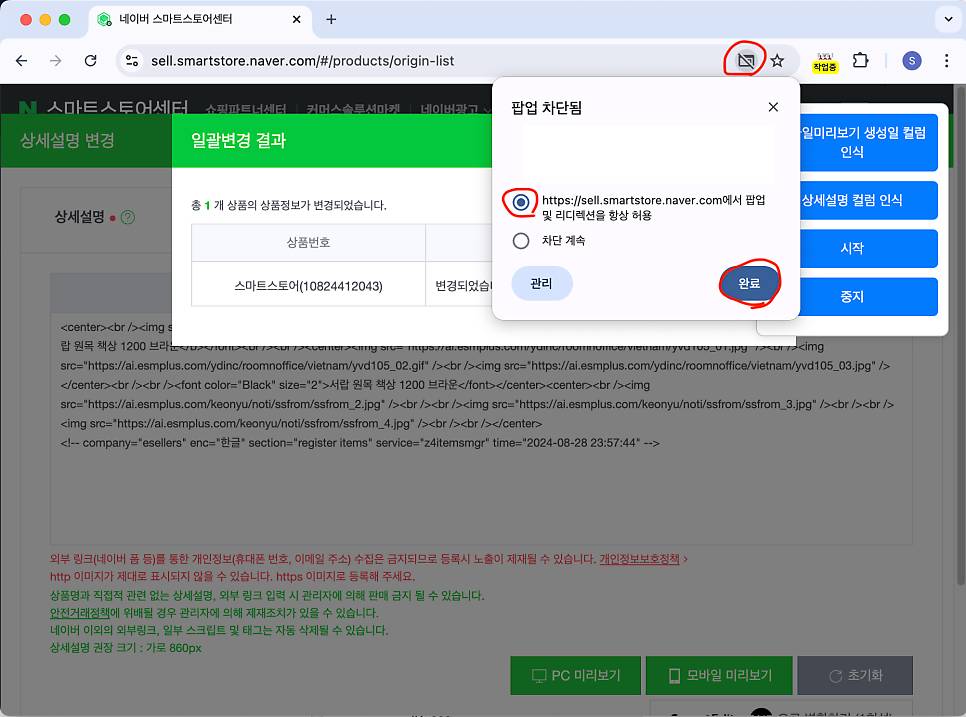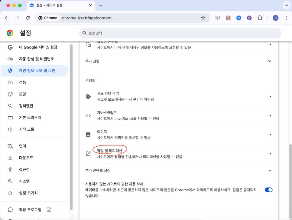 1.팝업 허용: "팝업 및 리다이렉션을 항상 허용" 선택