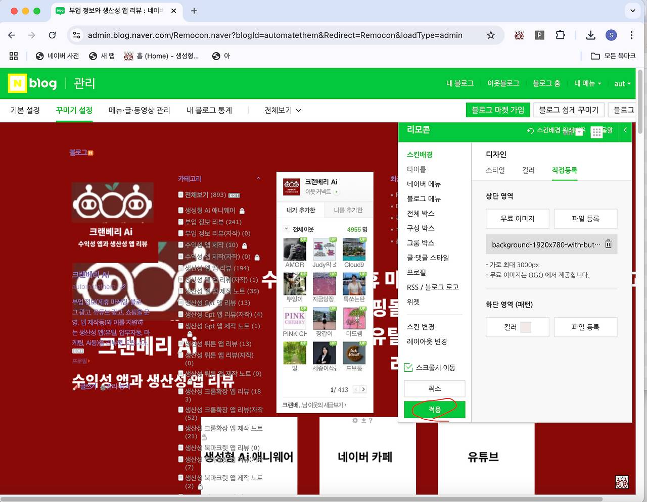 1. 관리 - 꾸미기 설정 - 스킨 선택 - 세부 디자인 설정 - 스킨배경 - 디자인 - 직접 등록 - 상단 영역 - 파일 등록