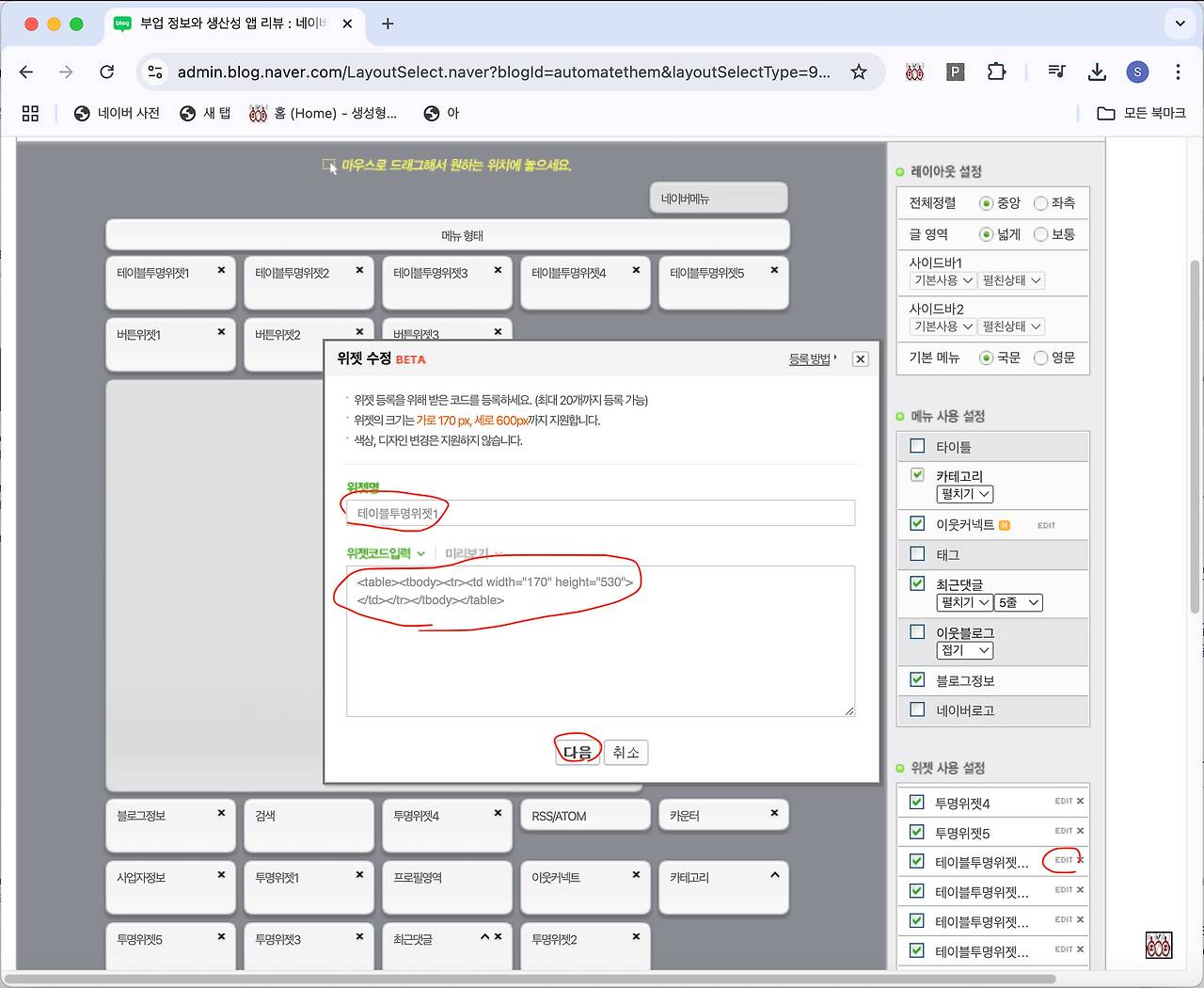 관리 > 꾸미기 설정 > 레이아웃 위젯 설정 > 우측에서 두 번째 레이아웃 선택 > 위젯 직접 등록 클릭 후 투명 위젯 등록