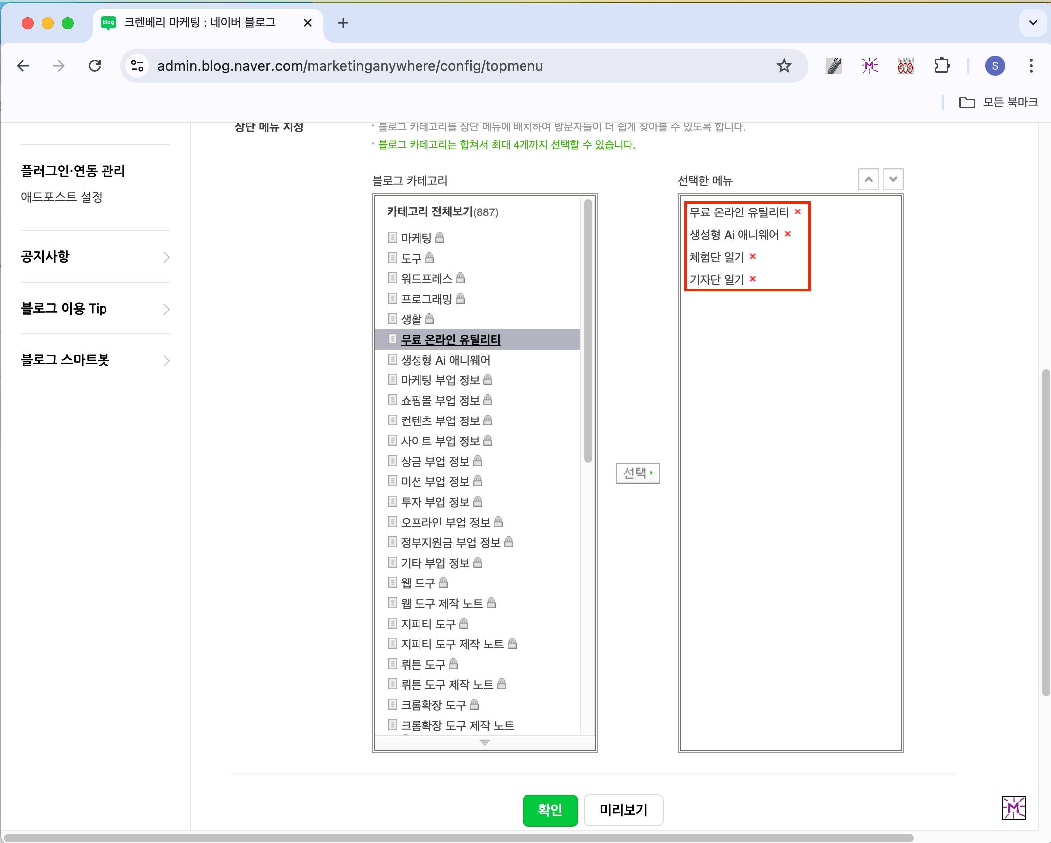 관리 - 메뉴·글·동영상 관리 - 상단메뉴 설정 - 상단 메뉴 지정